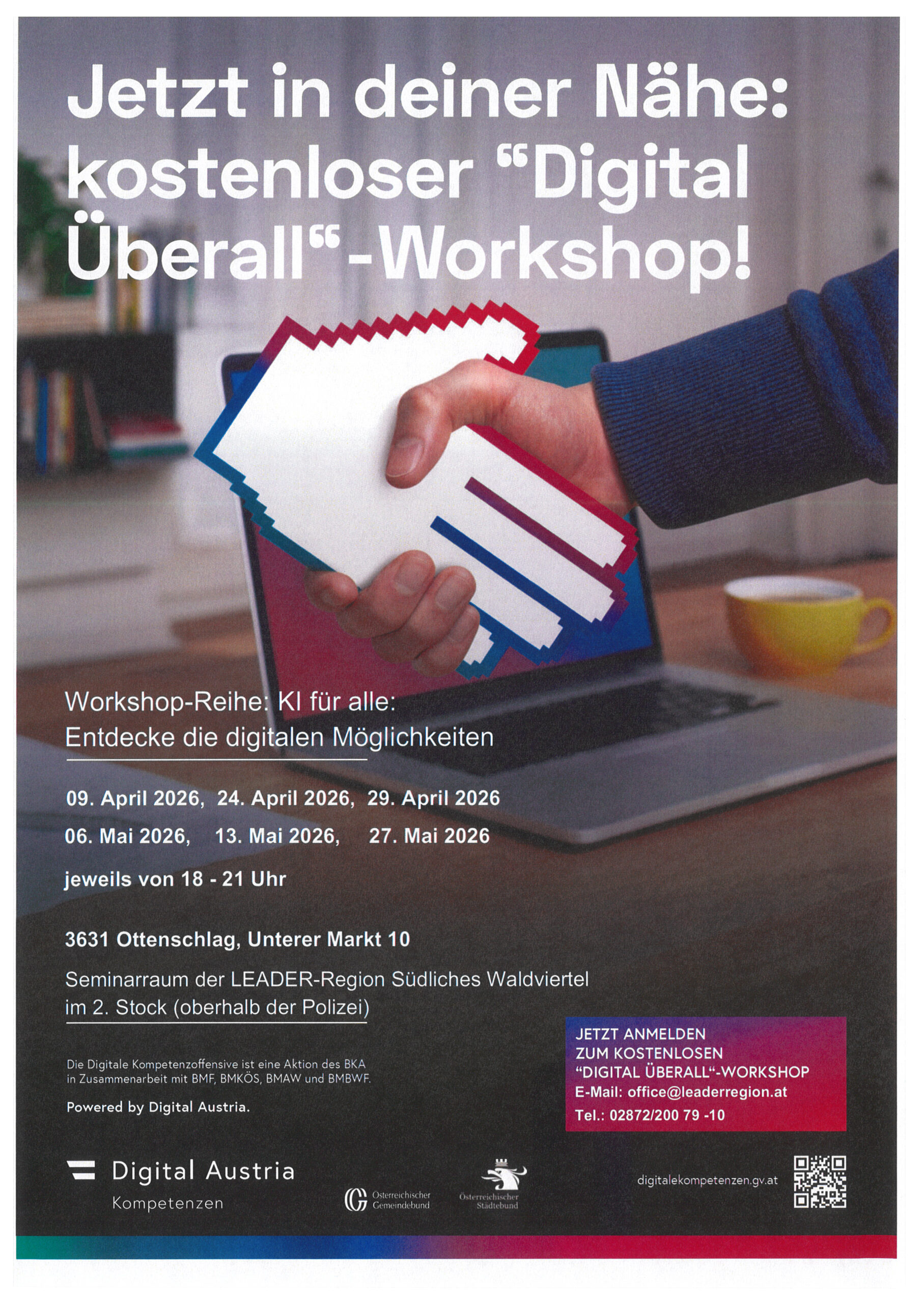 Im Seminarraum der LEADER-Region Südliches Waldviertel – Nibelungengau finden ab 9.April bis Ende Mai 2026 kostenlose Kurse aus der Workshopreihe „Digital Überall“ ( insg.6 Kurse), geleitet von Dipl. Trainer, Dipl. Coach Helmut Feichtinger zum Thema: