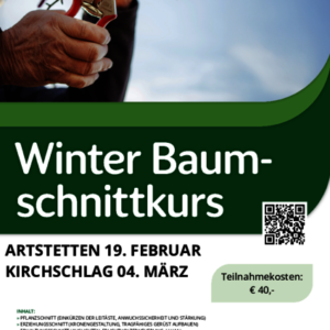 Baumschnitt- u. Veredlungskurse 2026 Am 19.02.2026 in 3661 Artstetten, Schlossstraße 2 im Schlossgasthof oder am 4.03.2026 in Kirchschlag / 3650 […]